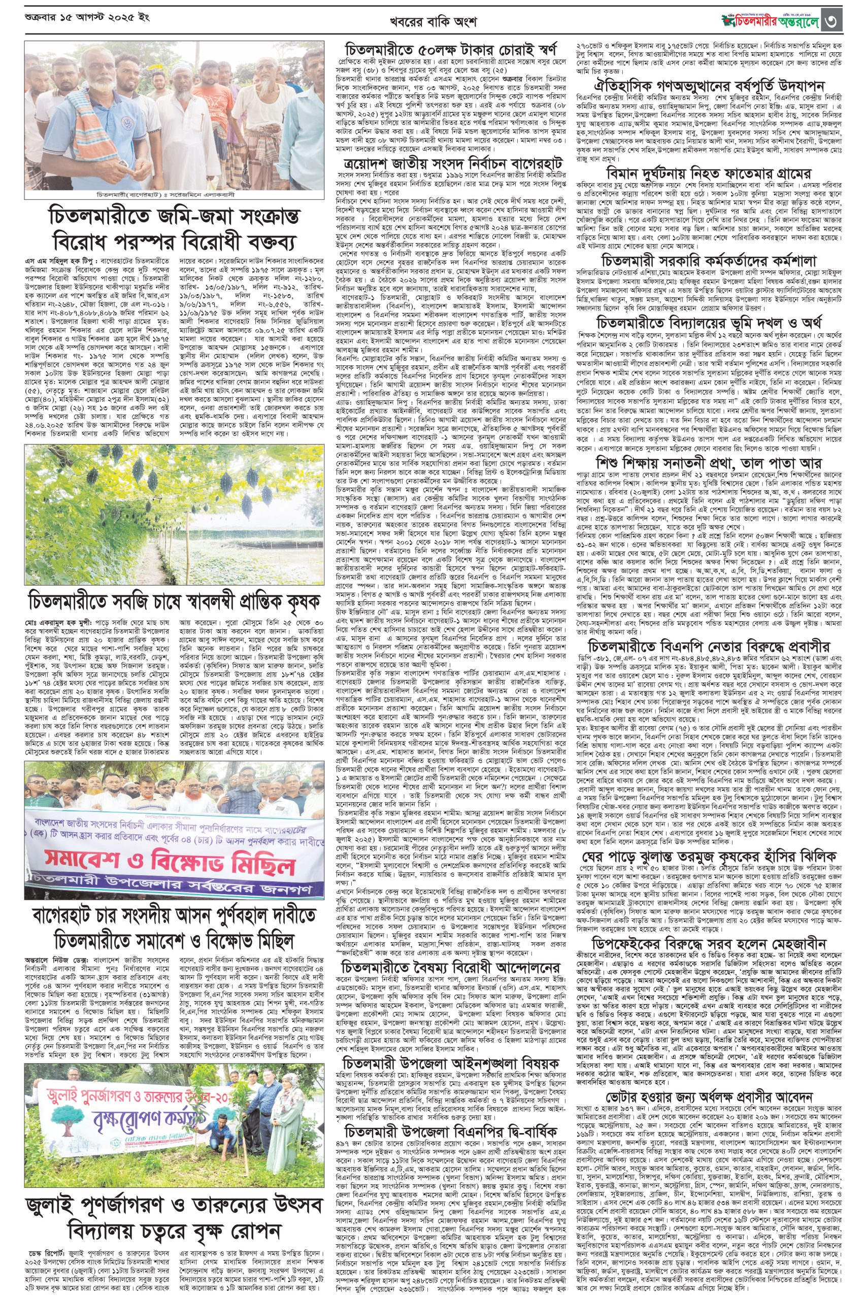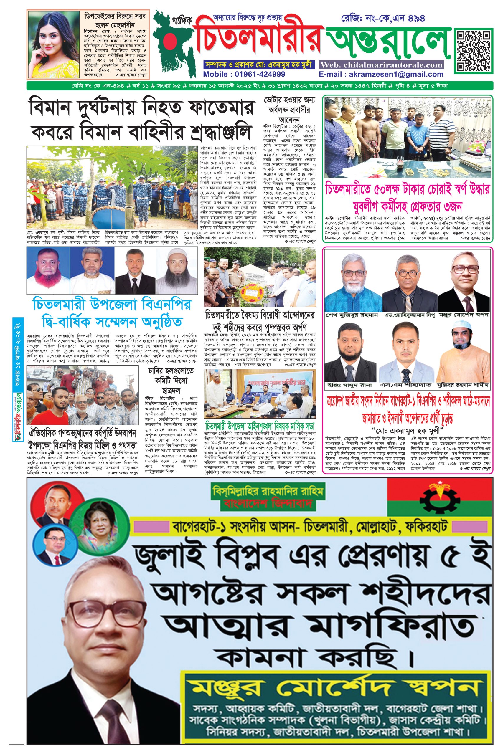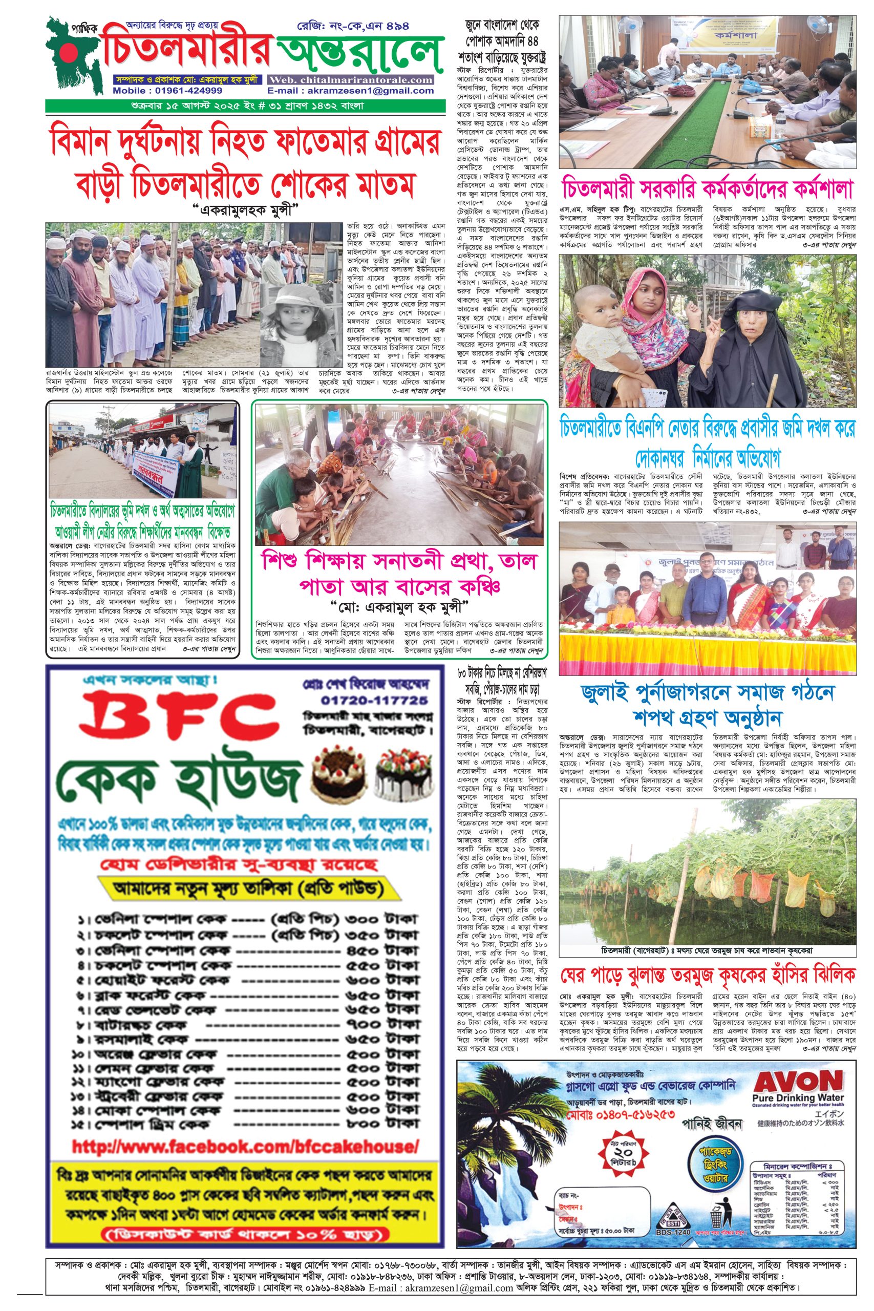 সম্পাদক ও প্রকাশক মোঃ একরামুল হক মুন্সী, ব্যবস্থাপনা সম্পাদক মঞ্জুর মোর্শেদ স্বপন মোবা: ০১৭৬৮-৭৩০০৬৮, বার্তা সম্পাদক তানজীর মুন্সী, আইন বিষয়ক সম্পাদক এ্যাডভোকেট এস এম ইমরান হোসেন, সাহিত্য বিষয়ক সম্পাদক: দেবকী মল্লিক, খুলনা ব্যুরো চীফ মুহাম্মদ নাঈমুজ্জামান শরীফ, মোবা: ০১৯১৮-৮৪৮২৩৬, ঢাকা অফিস: প্রশান্তি টাওয়ার, ৮-অভয়দাস লেন, ঢাকা-১২০৩, মোবা: ০১৯১৯-৮৩৪১৬৪, সম্পাদকীয় কার্যালয়: থানা মসজিদের পশ্চিম, চিতলমারী, বাগেরহাট। মোবাইল নং ০১৯৬১-৪২৪৯৯৯ E-mail: akramzesen1@gmail.com অলিফ প্রিন্টিং প্রেস, ২২১ ফকিরা পুল, ঢাকা থেকে মুদ্রিত ও চিতলমারী থেকে প্রকাশিত।